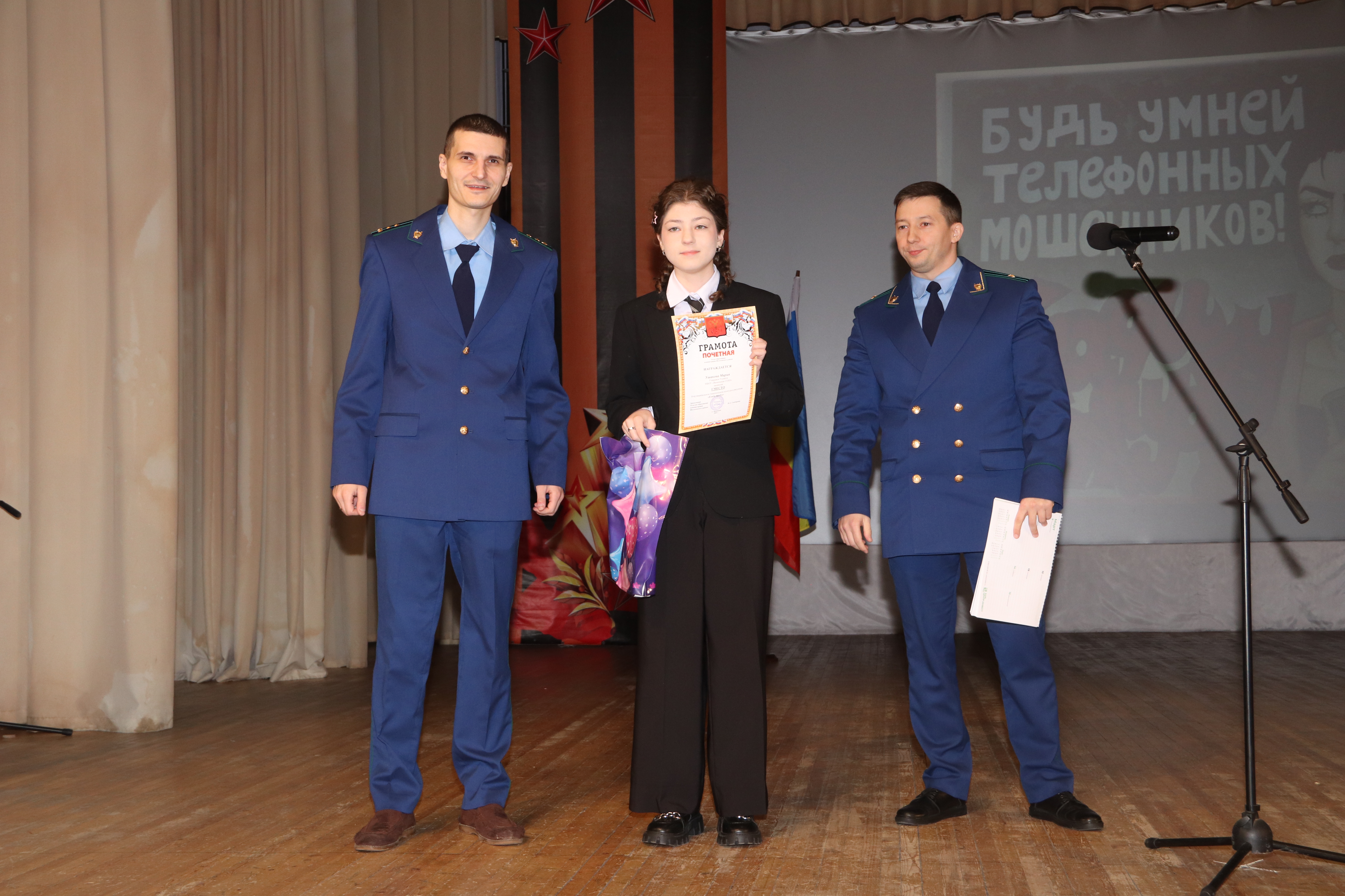 Наталья Владимировна Тарабцова, начальник штаба отделения ВВПОД «Юнармия» Шолоховского района, вручила кубки победителей и грамоты регионального отделения военно-патриотического общественного движения «ЮНАРМИЯ» лучшим юнармейским отрядам « Донские ястребы» и «Патриоты России» имени Точилкина Петра Дмитриевича Шолоховской гимназии , а также Знаки юнармейской доблести самым активным участникам движения в Шолоховском районе Задорожной Маргарите, отряд «Патриоты России» Шолоховской гимназии, - 3 степени и Ходыкину Владимиру, отряд «Азимут» Базковская школа, 2 степени.